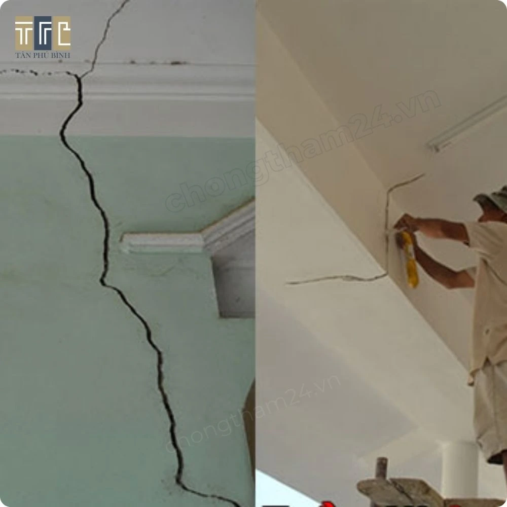 Đây là loại nứt nguy hiểm, thường đi kèm võng trần hoặc thấm nước. Cần đánh giá bởi thợ chuyên nghiệp để xử lý đúng cách.