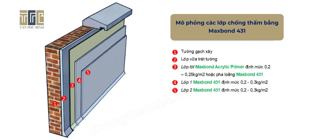 - Thi công Maxbond 431 tối thiểu 2-3 lớp, không pha loãng với định mức 0.3kg/m2 bằng chổi sơn hoặc rulo.