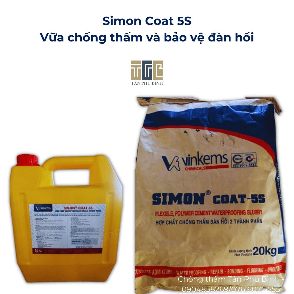 Vữa chống thấm Vinkems Simon Coat 5S hai thành phần (25kg) được trộn đều với nhau tạo thành lớp màng dẻo chống thấm. Đây là một trong các chất chống thấm gốc xi măng bảo vệ cho bề mặt bê tông và nhiều khu vực tại công trình.