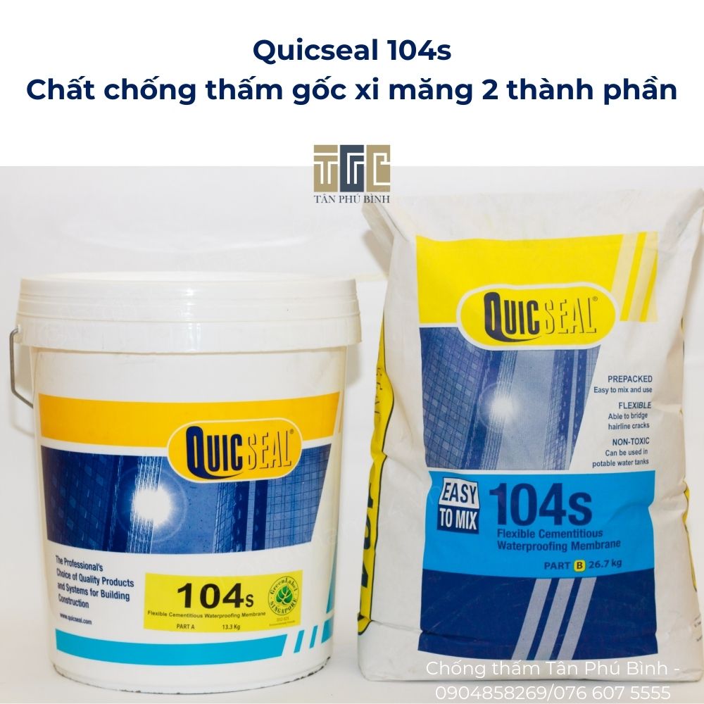 Chất chống thấm Quicseal 104s là sản phẩm màng chống thấm xi măng dẻo hai thành phần bao gồm nhựa tổng hợp pha trộn với hỗn hợp xi măng được chọn lọc và các chất phụ gia cao cấp khác. Khi được trộn, Quicseal 104s trở thành hỗn hợp vữa mịn và dễ dàng thi công bằng cọ, rulo hoặc các thiết bị phun phù hợp.