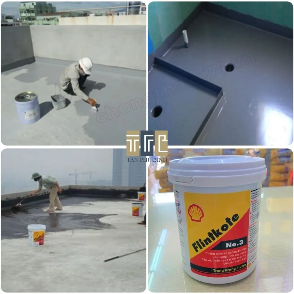 Khuấy đều vật liệu trước khi sử dụng. Phủ tối thiểu 2 lớp Flintkote 3 bằng rulô, chổi hoặc bằng thiết bị phun. Để lớp thứ nhất khô trước khi phủ lớp thứ 2 theo chiều vuông góc với lớp trước. Lớp phủ Flintkote 3 thông thường khô trong vòng 24 giơ và tạo thành lớp màng chống thấm đàn hồi và rất bền.
