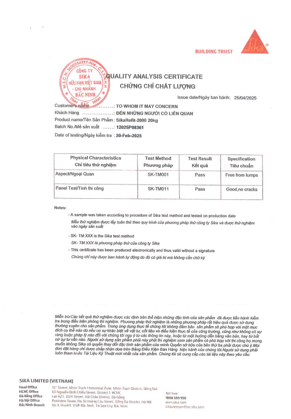 Sản phẩm vữa Sika Refit 2000 có đầy đủ chứng từ, chứng chỉ chất lượng đạt chỉ tiêu thông số như công bố, đảm bảo an toàn và hiệu quả trong quá trình sử dụng.