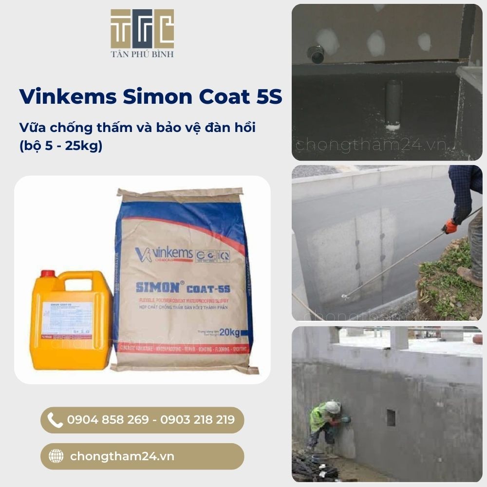 Vữa chống thấm Vinkems Simon Coat 5S hai thành phần (25kg) được trộn đều với nhau tạo thành lớp màng dẻo chống thấm. Đây là một trong các chất chống thấm gốc xi măng bảo vệ cho bề mặt bê tông và nhiều khu vực tại công trình.