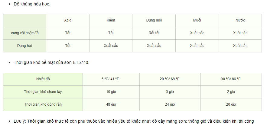 Độ phủ lý thuyết: 1 lít sơn phủ epoxy ET5740 sơn được 10m2 với độ dày màng sơn khi khô là 100 micron trên bề mặt láng mịn
